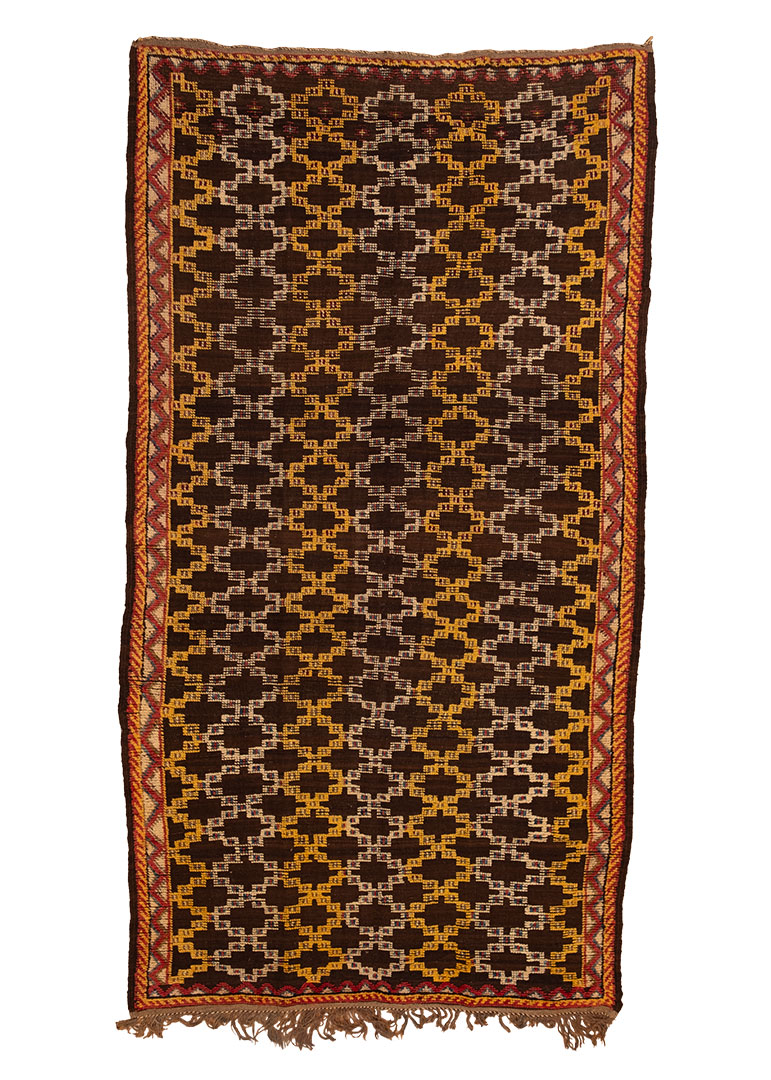 This gorgeous carpet features a dark brown, almost black, natural wool, kilim base with a delicate and intricate knotted pile design in whites, blues, yellows and reds on top.